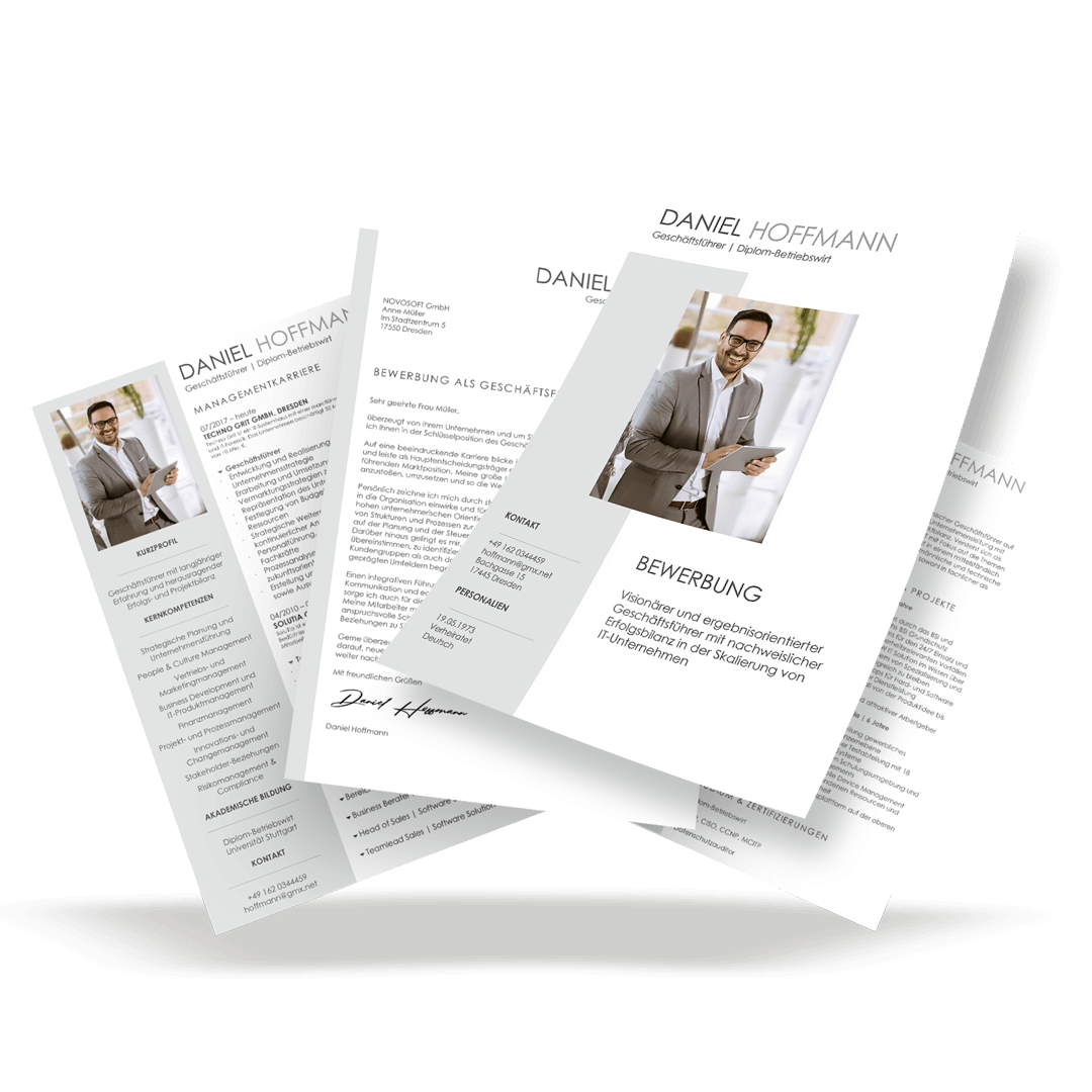 Als Managementpersönlichkeit benötigen Sie mehr als eine Standardbewerbung. Struktur und Inhalt Ihrer Unterlagen gestalten wir individuell – strategisch, überzeugend und passgenau auf Ihre Managementerfahrung und angestrebte Position zugeschnitten. So entsteht ein professioneller Auftritt mit Profil und Aussagekraft. Die oben dargestellte Layoutvorschau dient lediglich als Beispiel. In dieser Abbildung sehen Sie eine fertig gestaltete Bewerbung im Design „Business“.